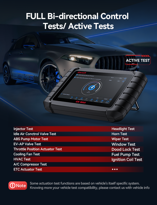 The CR Max supports active tests across many systems, allowing direct control of components such as: