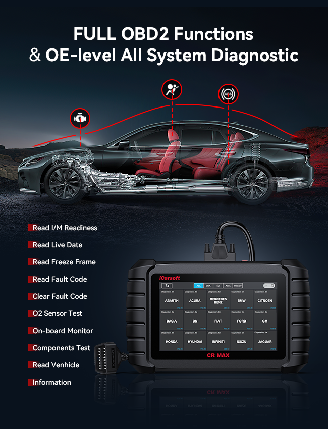 The iCarsoft CR Max is designed for users who want more than a handheld scanner but do not need the full capability of high-end workshop tablets. With full system diagnostics, bi-directional control, advanced service functions, and a large touchscreen interface, it offers a strong balance of performance, usability, and value for both professional and home workshop environments.