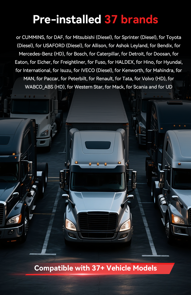 CUMMINS, DAF, Mitsubishi Diesel, Sprinter Diesel, Toyota Diesel, USA Ford Diesel, Allison, Ashok Leyland, Bendix, Mercedes Benz HD, Bosch, Caterpillar, Detroit, Doosan, Eaton, Eicher, Freightliner, Fuso, Haldex, Hino, Hyundai, International, Isuzu, Iveco Diesel, Kenworth, Mahindra, MAN, Paccar, Peterbilt, Renault, Tata, Volvo HD, WABCO ABS HD, Western Star, Mack, Scania, UD